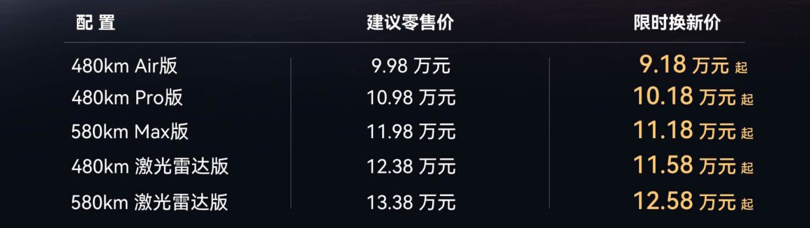 The discounted price requires a trade-in as well as limited-time special discounts but starts from 91,800 Yuan and steps up to 125,800 for the top-of-the-line model with the 58.3 kWh battery and LiDAR.