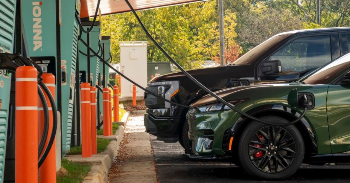 Ford F-150 Lightning and Mustang Mach-E charging at an IONNA station (Source: Ford)