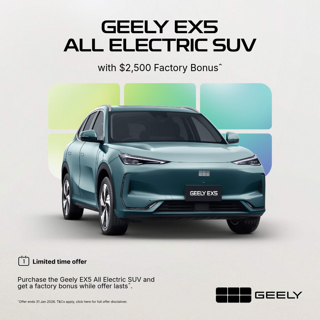 This offer is eligible to customers who purchase a new or demonstrator MY25 or MY26 Geely EX5 from a Geely Dealer between 1 January 2026 and 31 January 2026 and take delivery by the end of the month.